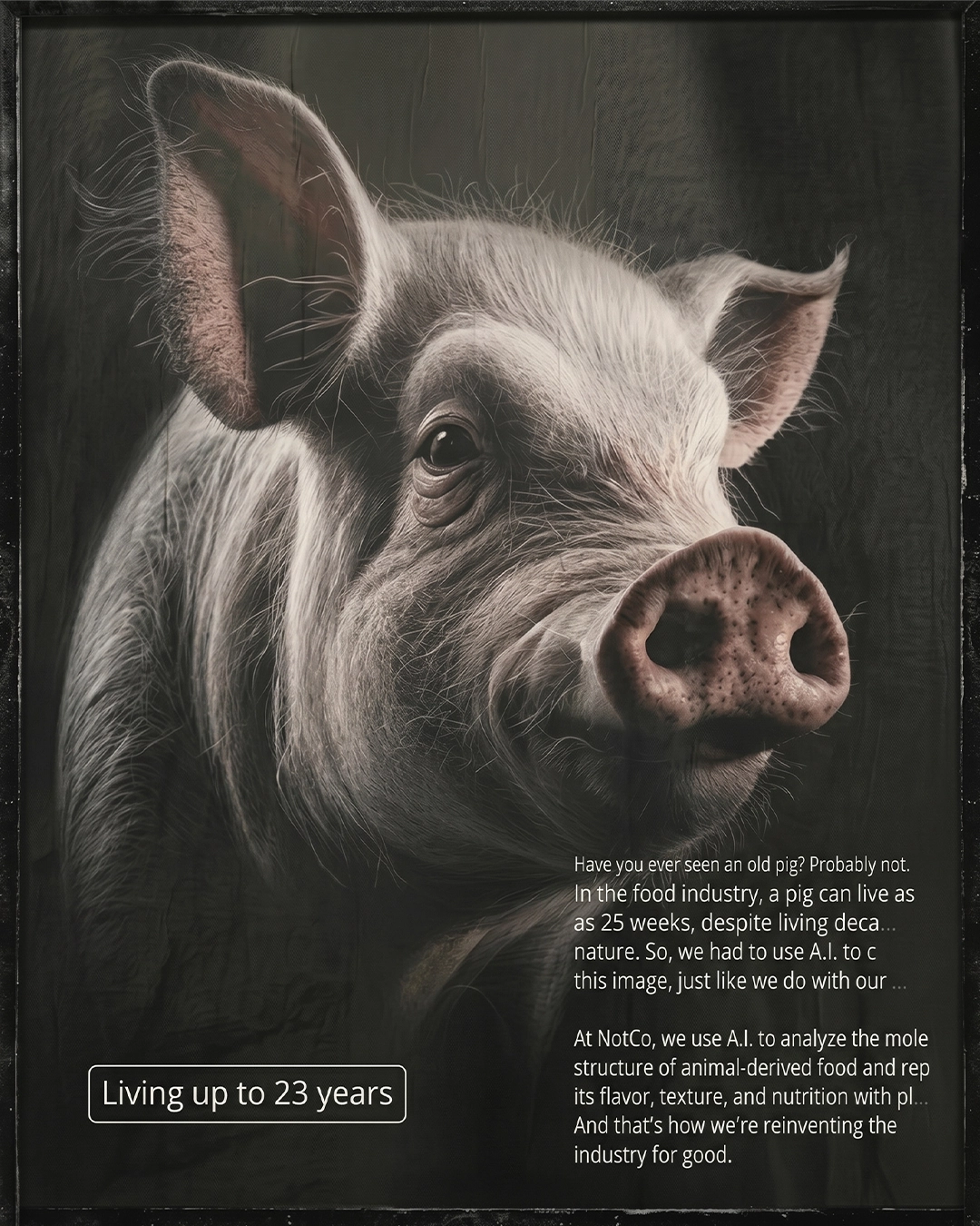 Qual foi a última vez que viu uma vaca, um porco ou uma galinha envelhecidos? A maior parte das pessoas não os vê e essa é a crítica da NotCo. A empresa de tecnologia alimentar que usa IA (Inteligência Artificial) para criar um mundo mais sustentável, retirando os animais da equação, agora usou IA para comunicar e educar: