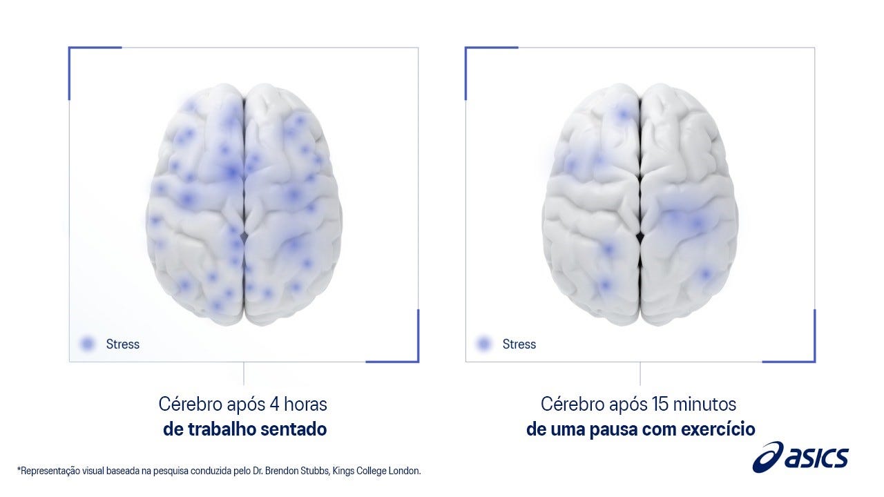 Esta mensagem é-nos apresentada com base num estudo da ASICS, realizado com 26 mil participantes, que revelou uma ligação entre o comportamento sedentário e o bem-estar mental. Quanto mais tempo as pessoas ficam sentadas à secretária, mais os níveis de stress aumentam... e uma pausa de 15 minutos pode fazer toda a diferença.