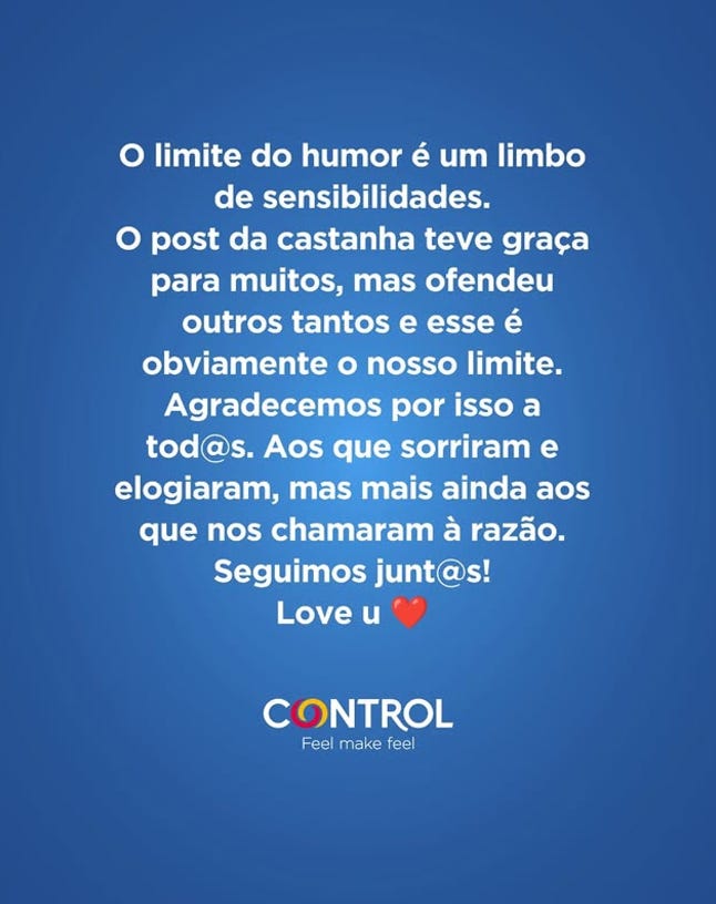Mas a Control não é um humorista nem tem a responsabilidade de desafiar os limites do humor. Poderia tê-lo feito, claro que sim. Mas a marca preferiu defender outra causa e outra comunidade que está mais em linha com os seus valores. E foi por isso que tantas pessoas se sentiram defraudadas com a decisão de apagar a publicação.