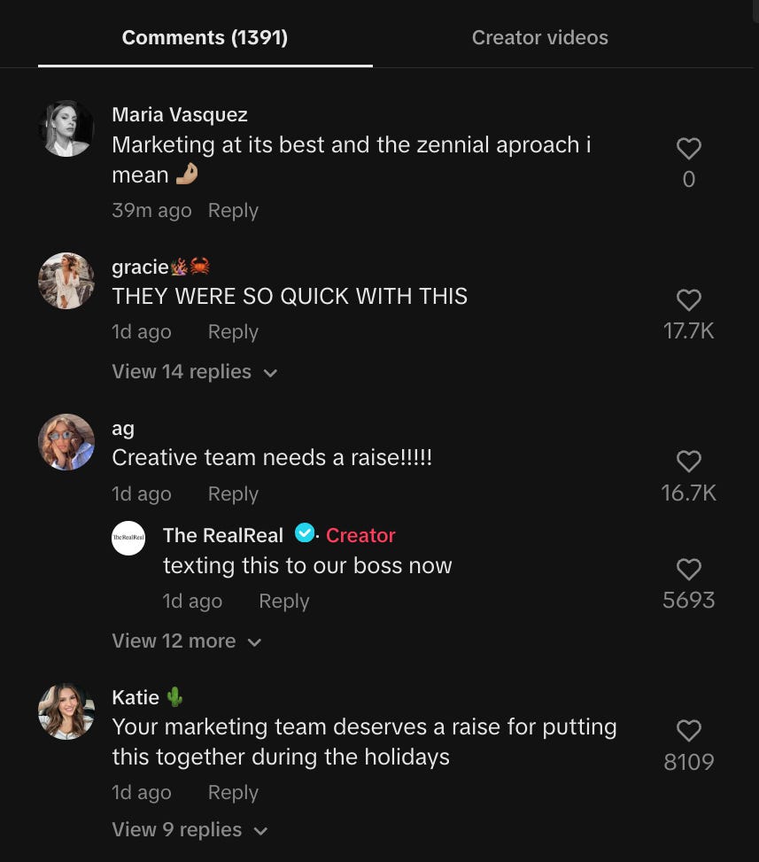 Mas, em vez de ignorar ou reagir de forma defensiva, a The RealReal aproveitou a crise para demonstrar transparência e liderança. Publicaram um vídeo no TikTok, uma “resposta-não-resposta”, mostrando os bastidores do seu processo de autenticação de produtos e reforçando os seus valores. Na primeira pessoa de um dos artigos de luxo que seria vendido na plataforma.